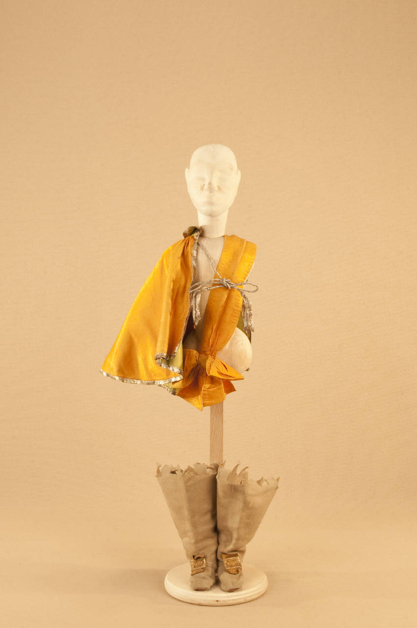 - NOTIZIE STORICO CRITICHE Il costume, che si completa con un cappello di feltro nero, è indossato da una marionetta con corpo e testa da gatto, in posizione eretta. "Il gatto con gli stivali" è una fiaba con struttura di operetta messa in scena nel 1911 da Carlo II Colla per la Compagnia Carlo Colla e Figli. Il manoscritto proviene dalla Compagnia Lupi che agiva al Teatro Gianduia di Torino: lo attesta una dicitura riportata sul retro della copertina. L¿edizione marionettistica della Compagnia Carlo Colla presenta nella forma della féerie (parti recitate alternate alle parti cantate e alle parti musicate) la celebre fiaba di Charles Perrault. La messa in scena risente del gusto dell'epoca verista dell'operetta e ricalca con notevole perizia i temi della nostra tradizione popolare. La musica del maestro Felice Camesasca sottolinea lo spettacolo in modo sovente ironico e sorprendente; le scene sono dello scenografo Achille Lualdi (1869-anni ¿50).\nIntervengono inoltre nello spettacolo, intuizioni culturali come il richiamo al mondo degli animali di La Fontane nel gioco teatrale del capovolgimento fra animale ed essere umano.\n"Il gatto con gli stivali" è una delle prime fiabe ad entrare nel repertorio della Compagnia Carlo Colla e Figli.\nNegli anni ¿20 alcuni costumi vengono sostituiti con abiti realizzati da Caramba. Nel 1946 viene realizzato dalla casa di produzione "Saturnia" un cortometraggio, per la regia di Mario Baffico (1907-1972). Nel 1973, in occasione delle riprese televisive prodotte dalla RAI per la trasmissione "Marionette e Burattini" con la regia di Eugenio Giacobino al Teatro Litta, Eugenio Monti Colla provvede al restauro di numerosi costumi. Nel 1987, per il riallestimento dello spettacolo al Teatro Litta, nell'ambito della collaborazione con il "CRT Artificio" (1986-1994), vengono realizzati nuovi costumi, nuove marionette e nuovi materiali di attrezzeria.
