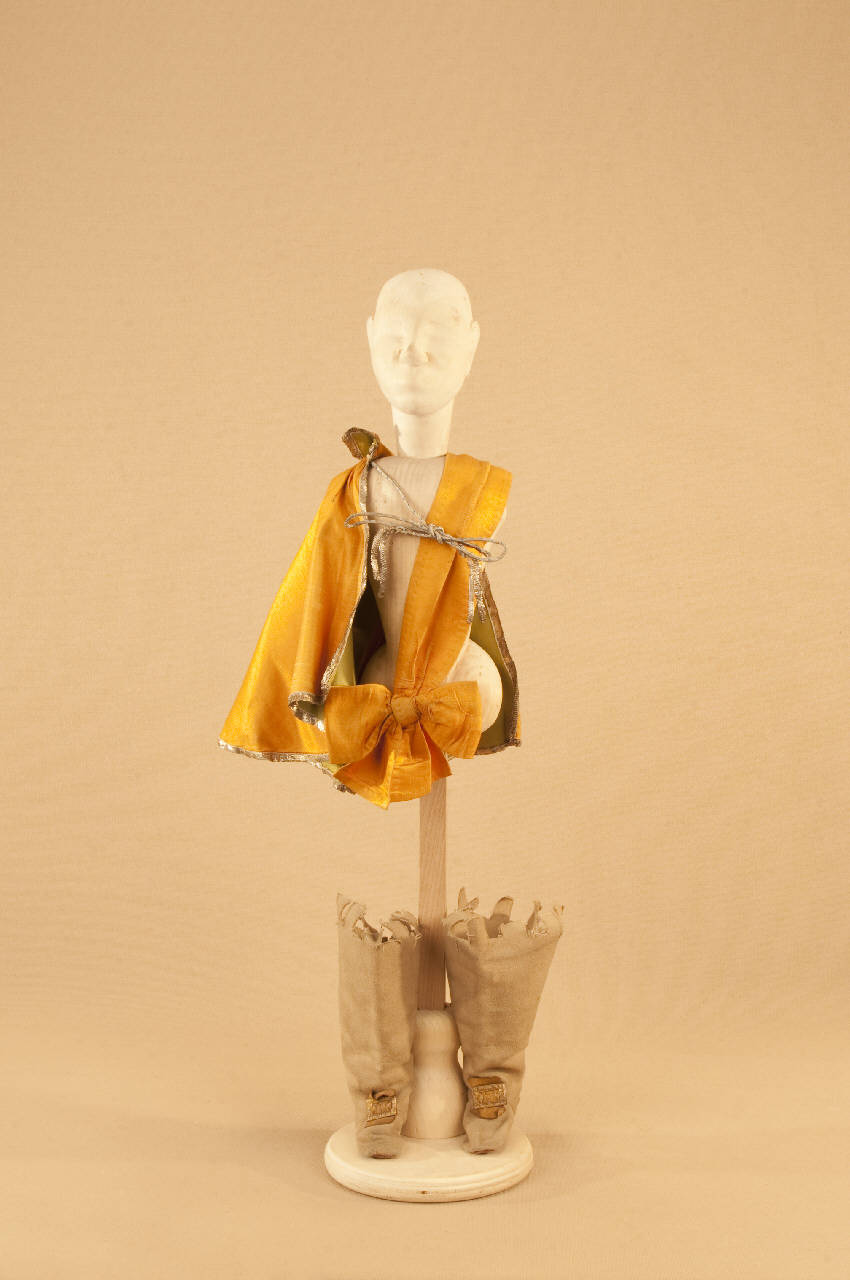 - NOTIZIE STORICO CRITICHE Il costume, che si completa con un cappello di feltro nero, è indossato da una marionetta con corpo e testa da gatto, in posizione eretta. "Il gatto con gli stivali" è una fiaba con struttura di operetta messa in scena nel 1911 da Carlo II Colla per la Compagnia Carlo Colla e Figli. Il manoscritto proviene dalla Compagnia Lupi che agiva al Teatro Gianduia di Torino: lo attesta una dicitura riportata sul retro della copertina. L¿edizione marionettistica della Compagnia Carlo Colla presenta nella forma della féerie (parti recitate alternate alle parti cantate e alle parti musicate) la celebre fiaba di Charles Perrault. La messa in scena risente del gusto dell'epoca verista dell'operetta e ricalca con notevole perizia i temi della nostra tradizione popolare. La musica del maestro Felice Camesasca sottolinea lo spettacolo in modo sovente ironico e sorprendente; le scene sono dello scenografo Achille Lualdi (1869-anni ¿50).\nIntervengono inoltre nello spettacolo, intuizioni culturali come il richiamo al mondo degli animali di La Fontane nel gioco teatrale del capovolgimento fra animale ed essere umano.\n"Il gatto con gli stivali" è una delle prime fiabe ad entrare nel repertorio della Compagnia Carlo Colla e Figli.\nNegli anni ¿20 alcuni costumi vengono sostituiti con abiti realizzati da Caramba. Nel 1946 viene realizzato dalla casa di produzione "Saturnia" un cortometraggio, per la regia di Mario Baffico (1907-1972). Nel 1973, in occasione delle riprese televisive prodotte dalla RAI per la trasmissione "Marionette e Burattini" con la regia di Eugenio Giacobino al Teatro Litta, Eugenio Monti Colla provvede al restauro di numerosi costumi. Nel 1987, per il riallestimento dello spettacolo al Teatro Litta, nell'ambito della collaborazione con il "CRT Artificio" (1986-1994), vengono realizzati nuovi costumi, nuove marionette e nuovi materiali di attrezzeria.