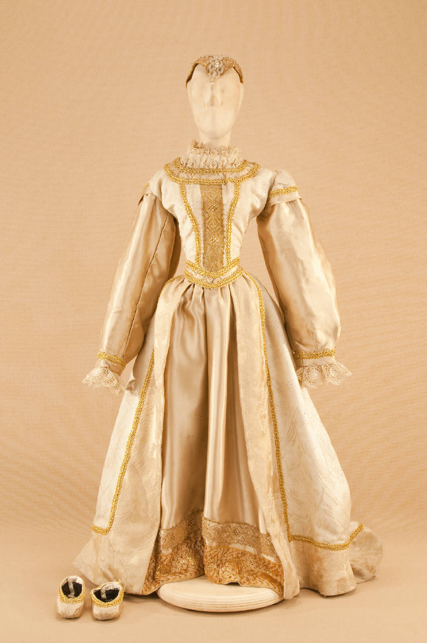 Costume da nobildonna di foggia tardo cinquecentesca composto da gonna, corpino, scarpe e copricapo.