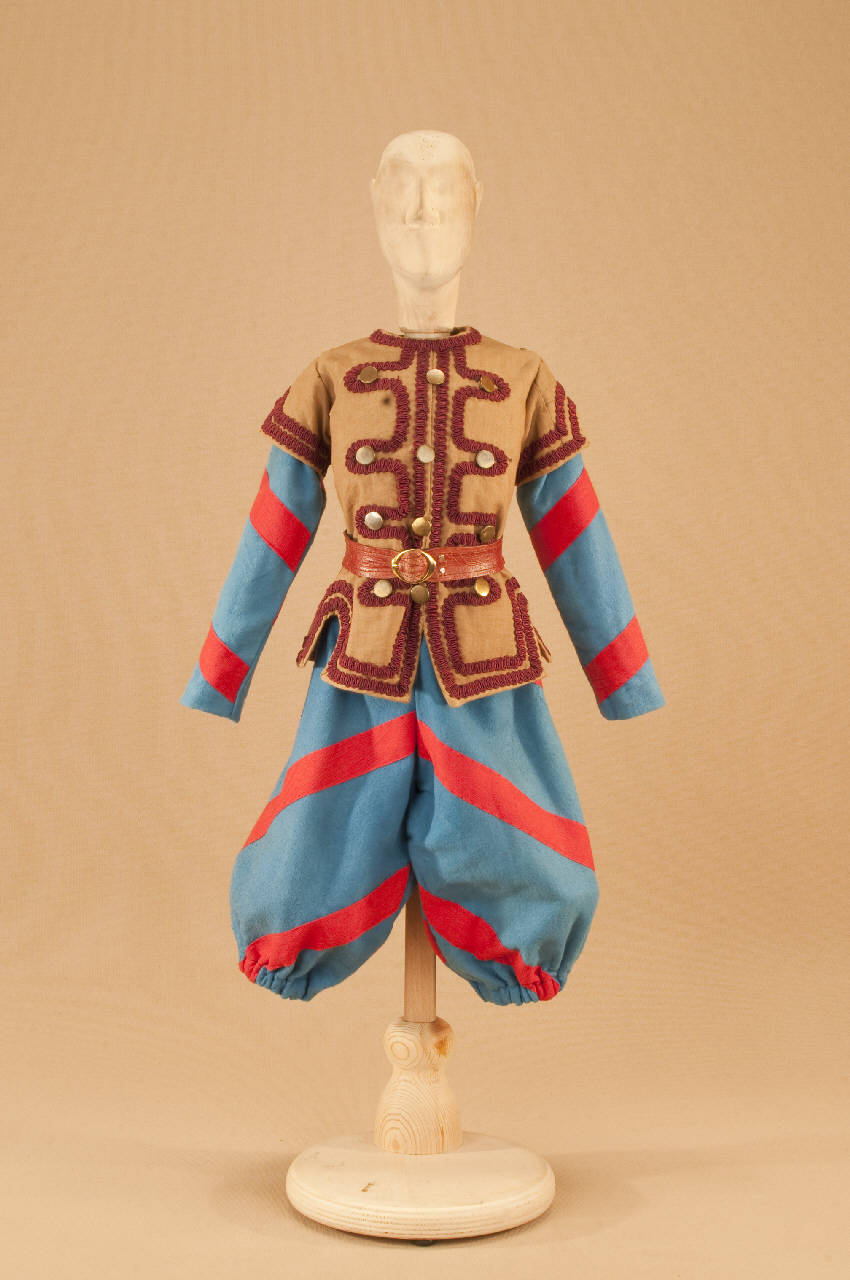 - NOTIZIE STORICO CRITICHE Il costume si completa con armatura e polsi in metallo, elmo, gorgiera, budriere e stivaletti. "Il gatto con gli stivali" è una fiaba con struttura di operetta messa in scena nel 1911 da Carlo II Colla per la Compagnia Carlo Colla e Figli. Il manoscritto proviene dalla Compagnia Lupi che agiva al Teatro Gianduia di Torino: lo attesta una dicitura riportata sul retro della copertina. L¿edizione marionettistica della Compagnia Carlo Colla presenta nella forma della féerie (parti recitate alternate alle parti cantate e alle parti musicate) la celebre fiaba di Charles Perrault. La messa in scena risente del gusto dell'epoca verista dell'operetta e ricalca con notevole perizia i temi della nostra tradizione popolare. La musica del maestro Felice Camesasca sottolinea lo spettacolo in modo sovente ironico e sorprendente; le scene sono dello scenografo Achille Lualdi (1869-anni ¿50).\nIntervengono inoltre nello spettacolo, intuizioni culturali come il richiamo al mondo degli animali di La Fontane nel gioco teatrale del capovolgimento fra animale ed essere umano.\n"Il gatto con gli stivali" è una delle prime fiabe ad entrare nel repertorio della Compagnia Carlo Colla e Figli.\nNegli anni ¿20 alcuni costumi vengono sostituiti con abiti realizzati da Caramba. Nel 1946 viene realizzato dalla casa di produzione "Saturnia" un cortometraggio, per la regia di Mario Baffico (1907-1972). Nel 1973, in occasione delle riprese televisive prodotte dalla RAI per la trasmissione "Marionette e Burattini" con la regia di Eugenio Giacobino al Teatro Litta, Eugenio Monti Colla provvede al restauro di numerosi costumi. Nel 1987, per il riallestimento dello spettacolo al Teatro Litta, nell'ambito della collaborazione con il "CRT Artificio" (1986-1994), vengono realizzati nuovi costumi, nuove marionette e nuovi materiali di attrezzeria.