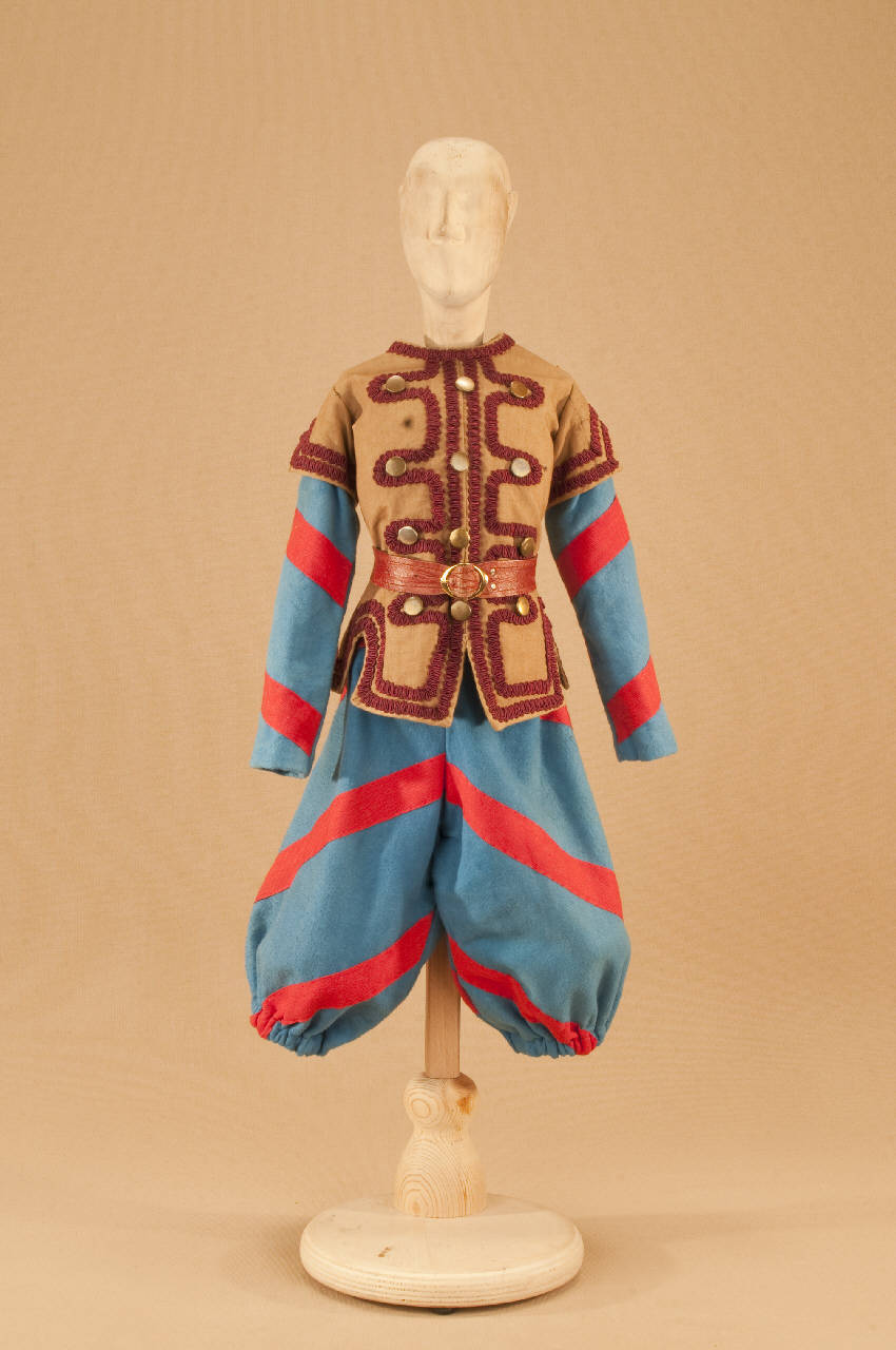 - NOTIZIE STORICO CRITICHE Il costume si completa con armatura e polsi in metallo, elmo, gorgiera, budriere e stivaletti. "Il gatto con gli stivali" è una fiaba con struttura di operetta messa in scena nel 1911 da Carlo II Colla per la Compagnia Carlo Colla e Figli. Il manoscritto proviene dalla Compagnia Lupi che agiva al Teatro Gianduia di Torino: lo attesta una dicitura riportata sul retro della copertina. L¿edizione marionettistica della Compagnia Carlo Colla presenta nella forma della féerie (parti recitate alternate alle parti cantate e alle parti musicate) la celebre fiaba di Charles Perrault. La messa in scena risente del gusto dell'epoca verista dell'operetta e ricalca con notevole perizia i temi della nostra tradizione popolare. La musica del maestro Felice Camesasca sottolinea lo spettacolo in modo sovente ironico e sorprendente; le scene sono dello scenografo Achille Lualdi (1869-anni ¿50).\nIntervengono inoltre nello spettacolo, intuizioni culturali come il richiamo al mondo degli animali di La Fontane nel gioco teatrale del capovolgimento fra animale ed essere umano.\n"Il gatto con gli stivali" è una delle prime fiabe ad entrare nel repertorio della Compagnia Carlo Colla e Figli.\nNegli anni ¿20 alcuni costumi vengono sostituiti con abiti realizzati da Caramba. Nel 1946 viene realizzato dalla casa di produzione "Saturnia" un cortometraggio, per la regia di Mario Baffico (1907-1972). Nel 1973, in occasione delle riprese televisive prodotte dalla RAI per la trasmissione "Marionette e Burattini" con la regia di Eugenio Giacobino al Teatro Litta, Eugenio Monti Colla provvede al restauro di numerosi costumi. Nel 1987, per il riallestimento dello spettacolo al Teatro Litta, nell'ambito della collaborazione con il "CRT Artificio" (1986-1994), vengono realizzati nuovi costumi, nuove marionette e nuovi materiali di attrezzeria.