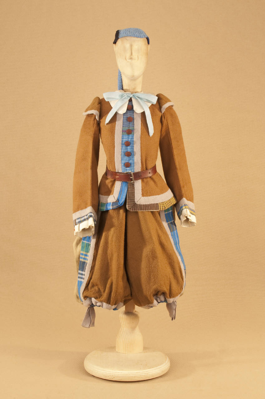 Costume da popolano di foggia seicentesca composto da calzoni, farsetto, collo, cintura, reticella e nastro per cravatta.