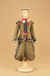 Costume da popolano di foggia seicentesca composto da calzoni, farsetto, collo, cintura, reticella e nastro per cravatta.