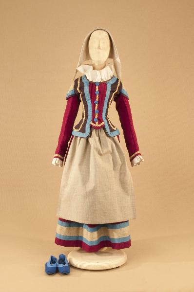 Costume da popolana di foggia seicentesca composto da gonna, corpino, grembiule, cuffia e scarpe.