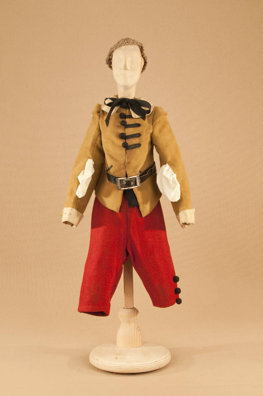 - NOTIZIE STORICO CRITICHE Il costume, che si completa con una finta camicia senza maniche, è stato confezionato nel 1935 per le riprese cinematografiche del film "I quattro Moschettieri"; in seguito il costume è stato usato per il personaggio di Stefanello nello spettacolo "Il gatto con gli stivali", fiaba con struttura di operetta messa in scena nel 1911 da Carlo II Colla per la Compagnia Carlo Colla e Figli. Il manoscritto proviene dalla Compagnia Lupi che agiva al Teatro Gianduia di Torino: lo attesta una dicitura riportata sul retro della copertina. L¿edizione marionettistica della Compagnia Carlo Colla presenta nella forma della féerie (parti recitate alternate alle parti cantate e alle parti musicate) la celebre fiaba di Charles Perrault. La messa in scena risente del gusto dell'epoca verista dell'operetta e ricalca con notevole perizia i temi della nostra tradizione popolare. La musica del maestro Felice Camesasca sottolinea lo spettacolo in modo sovente ironico e sorprendente; le scene sono dello scenografo Achille Lualdi (1869-anni ¿50).\nIntervengono inoltre nello spettacolo, intuizioni culturali come il richiamo al mondo degli animali di La Fontane nel gioco teatrale del capovolgimento fra animale ed essere umano.\n"Il gatto con gli stivali" è una delle prime fiabe ad entrare nel repertorio della Compagnia Carlo Colla e Figli.\nNegli anni ¿20 alcuni costumi vengono sostituiti con abiti realizzati da Caramba. Nel 1946 viene realizzato dalla casa di produzione "Saturnia" un cortometraggio, per la regia di Mario Baffico (1907-1972). Nel 1973, in occasione delle riprese televisive prodotte dalla RAI per la trasmissione "Marionette e Burattini" con la regia di Eugenio Giacobino al Teatro Litta, Eugenio Monti Colla provvede al restauro di numerosi costumi. Nel 1987, per il riallestimento dello spettacolo al Teatro Litta, nell'ambito della collaborazione con il "CRT Artificio" (1986-1994), vengono realizzati nuovi costumi, nuove marionette e nuovi materiali di attrezzeria.