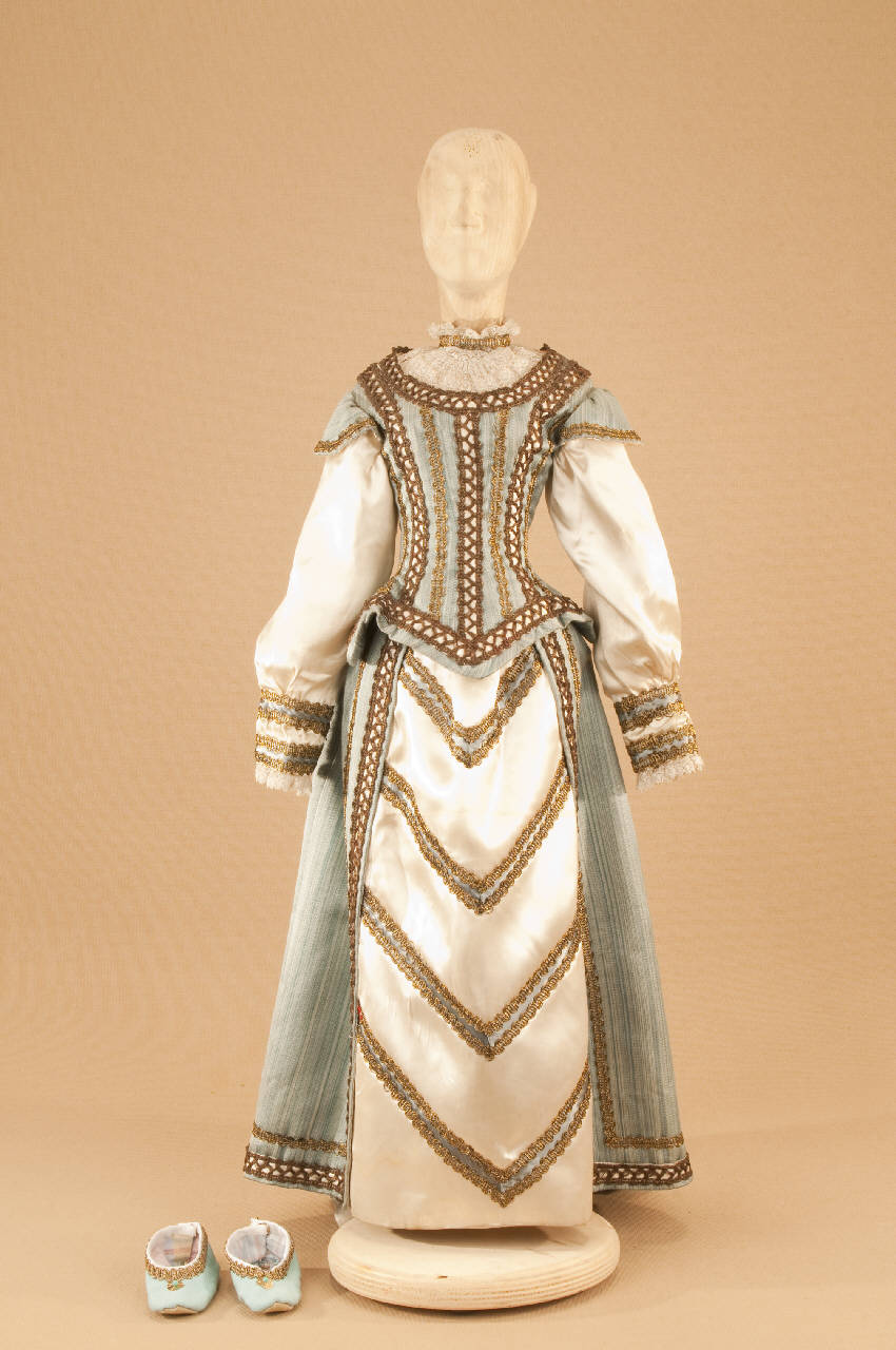 Costume da nobildonna di foggia tardo cinquecentesca composto da gonna, corpino e scarpe.