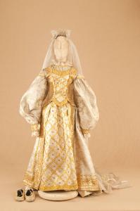 Costume da nobildonna di foggia seicentesca composto da gonna, corpino, velo e scarpe.