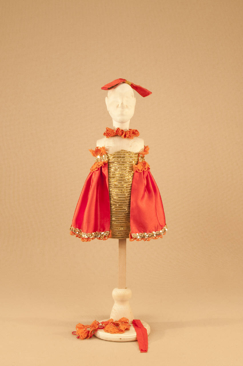 - NOTIZIE STORICO CRITICHE Il costume è indossato da una marionetta con corpo e testa da gatto, in posizione eretta. "Il gatto con gli stivali" è una fiaba con struttura di operetta messa in scena nel 1911 da Carlo II Colla per la Compagnia Carlo Colla e Figli. Il manoscritto proviene dalla Compagnia Lupi che agiva al Teatro Gianduia di Torino: lo attesta una dicitura riportata sul retro della copertina. L¿edizione marionettistica della Compagnia Carlo Colla presenta nella forma della féerie (parti recitate alternate alle parti cantate e alle parti musicate) la celebre fiaba di Charles Perrault. La messa in scena risente del gusto dell'epoca verista dell'operetta e ricalca con notevole perizia i temi della nostra tradizione popolare. La musica del maestro Felice Camesasca sottolinea lo spettacolo in modo sovente ironico e sorprendente; le scene sono dello scenografo Achille Lualdi (1869-anni ¿50).\nIntervengono inoltre nello spettacolo, intuizioni culturali come il richiamo al mondo degli animali di La Fontane nel gioco teatrale del capovolgimento fra animale ed essere umano.\n"Il gatto con gli stivali" è una delle prime fiabe ad entrare nel repertorio della Compagnia Carlo Colla e Figli.\nNegli anni ¿20 alcuni costumi vengono sostituiti con abiti realizzati da Caramba. Nel 1946 viene realizzato dalla casa di produzione "Saturnia" un cortometraggio, per la regia di Mario Baffico (1907-1972). Nel 1973, in occasione delle riprese televisive prodotte dalla RAI per la trasmissione "Marionette e Burattini" con la regia di Eugenio Giacobino al Teatro Litta, Eugenio Monti Colla provvede al restauro di numerosi costumi. Nel 1987, per il riallestimento dello spettacolo al Teatro Litta, nell'ambito della collaborazione con il "CRT Artificio" (1986-1994), vengono realizzati nuovi costumi, nuove marionette e nuovi materiali di attrezzeria.