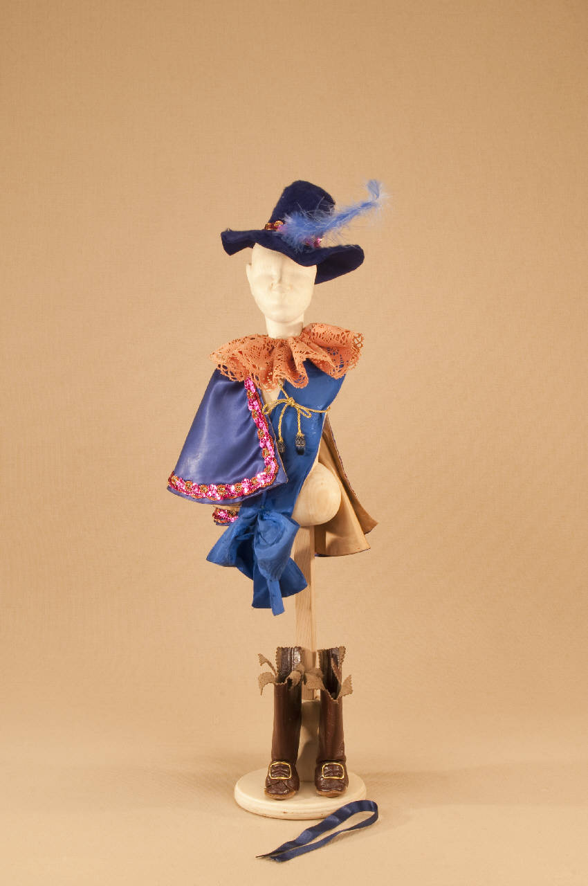 - NOTIZIE STORICO CRITICHE Il costume è indossato da una marionetta con corpo e testa da gatto, in posizione eretta. "Il gatto con gli stivali" è una fiaba con struttura di operetta messa in scena nel 1911 da Carlo II Colla per la Compagnia Carlo Colla e Figli. Il manoscritto proviene dalla Compagnia Lupi che agiva al Teatro Gianduia di Torino: lo attesta una dicitura riportata sul retro della copertina. L¿edizione marionettistica della Compagnia Carlo Colla presenta nella forma della féerie (parti recitate alternate alle parti cantate e alle parti musicate) la celebre fiaba di Charles Perrault. La messa in scena risente del gusto dell'epoca verista dell'operetta e ricalca con notevole perizia i temi della nostra tradizione popolare. La musica del maestro Felice Camesasca sottolinea lo spettacolo in modo sovente ironico e sorprendente; le scene sono dello scenografo Achille Lualdi (1869-anni ¿50).\nIntervengono inoltre nello spettacolo, intuizioni culturali come il richiamo al mondo degli animali di La Fontane nel gioco teatrale del capovolgimento fra animale ed essere umano.\n"Il gatto con gli stivali" è una delle prime fiabe ad entrare nel repertorio della Compagnia Carlo Colla e Figli.\nNegli anni ¿20 alcuni costumi vengono sostituiti con abiti realizzati da Caramba. Nel 1946 viene realizzato dalla casa di produzione "Saturnia" un cortometraggio, per la regia di Mario Baffico (1907-1972). Nel 1973, in occasione delle riprese televisive prodotte dalla RAI per la trasmissione "Marionette e Burattini" con la regia di Eugenio Giacobino al Teatro Litta, Eugenio Monti Colla provvede al restauro di numerosi costumi. Nel 1987, per il riallestimento dello spettacolo al Teatro Litta, nell'ambito della collaborazione con il "CRT Artificio" (1986-1994), vengono realizzati nuovi costumi, nuove marionette e nuovi materiali di attrezzeria.