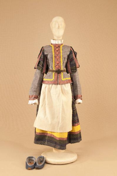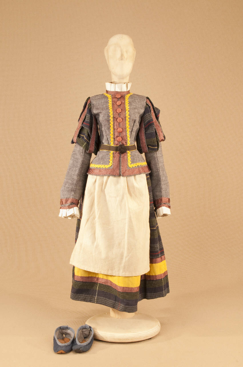 Costume da popolana di foggia seicentesca composto da gonna, corpino, grembiule e scarpe.