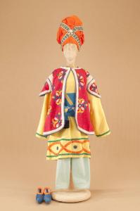Costume folcloristico orientale composto da pantaloni, veste, sopravveste, fusciacca, scarpe e turbante.