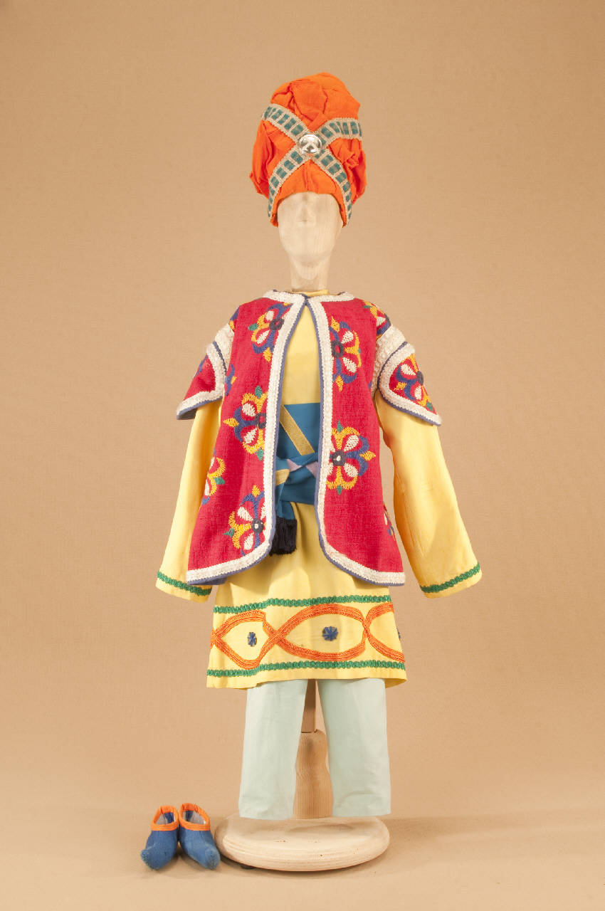 Costume folcloristico orientale composto da pantaloni, veste, sopravveste, fusciacca, scarpe e turbante.