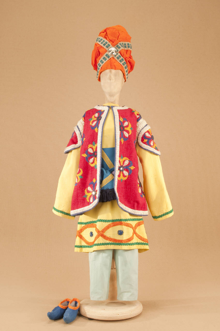 Costume folcloristico orientale composto da pantaloni, veste, sopravveste, fusciacca, scarpe e turbante.