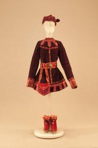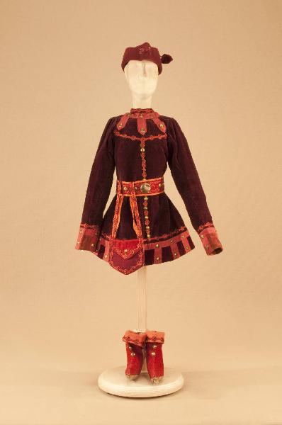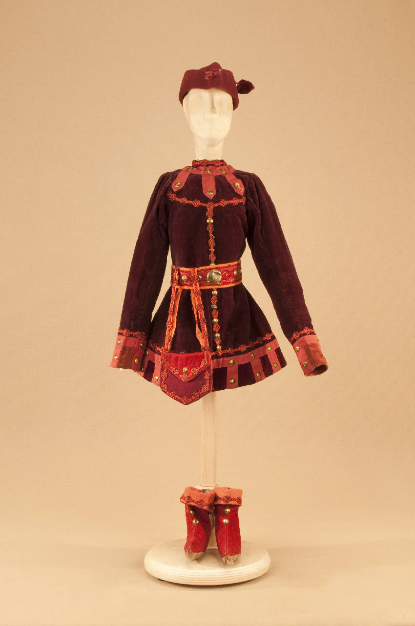 Costume da popolano di foggia quattrocentesca composto da veste, cintura (con borsetta), scarpe e cappello.