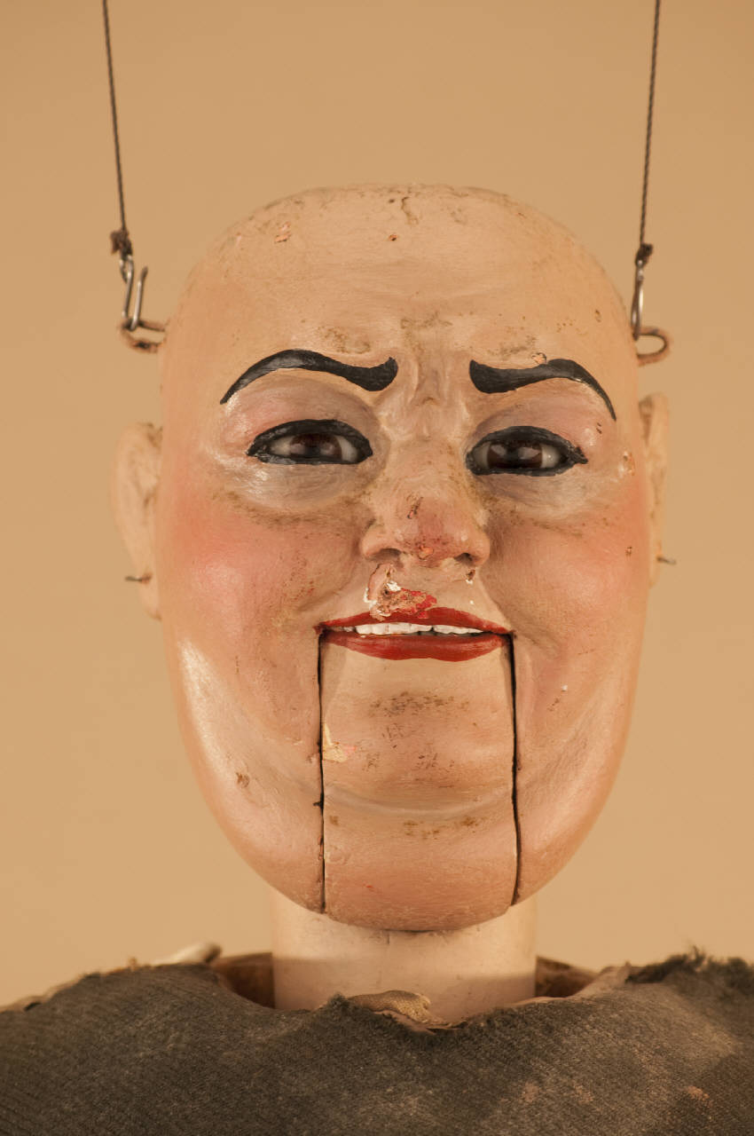 Testa in legno di tiglio con anello in ferro per bloccaggio al corpo. Occhi di vetro mobili. Bocca mobile. Tassello posteriore per intervenire sui meccanismi interni.