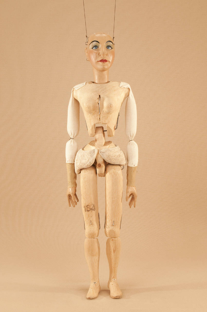 Testa di legno di tiglio fissata al corpo tramite ferro, occhi di vetro. Corpo normale in abete snodato in vita ad incastro. Gambe unite al bacino tramite bordione in ferro, ginocchia ad incastro mobile. Mani mobili in tiglio con dita scolpite e separate. Bilancino a croce metodo Holden.