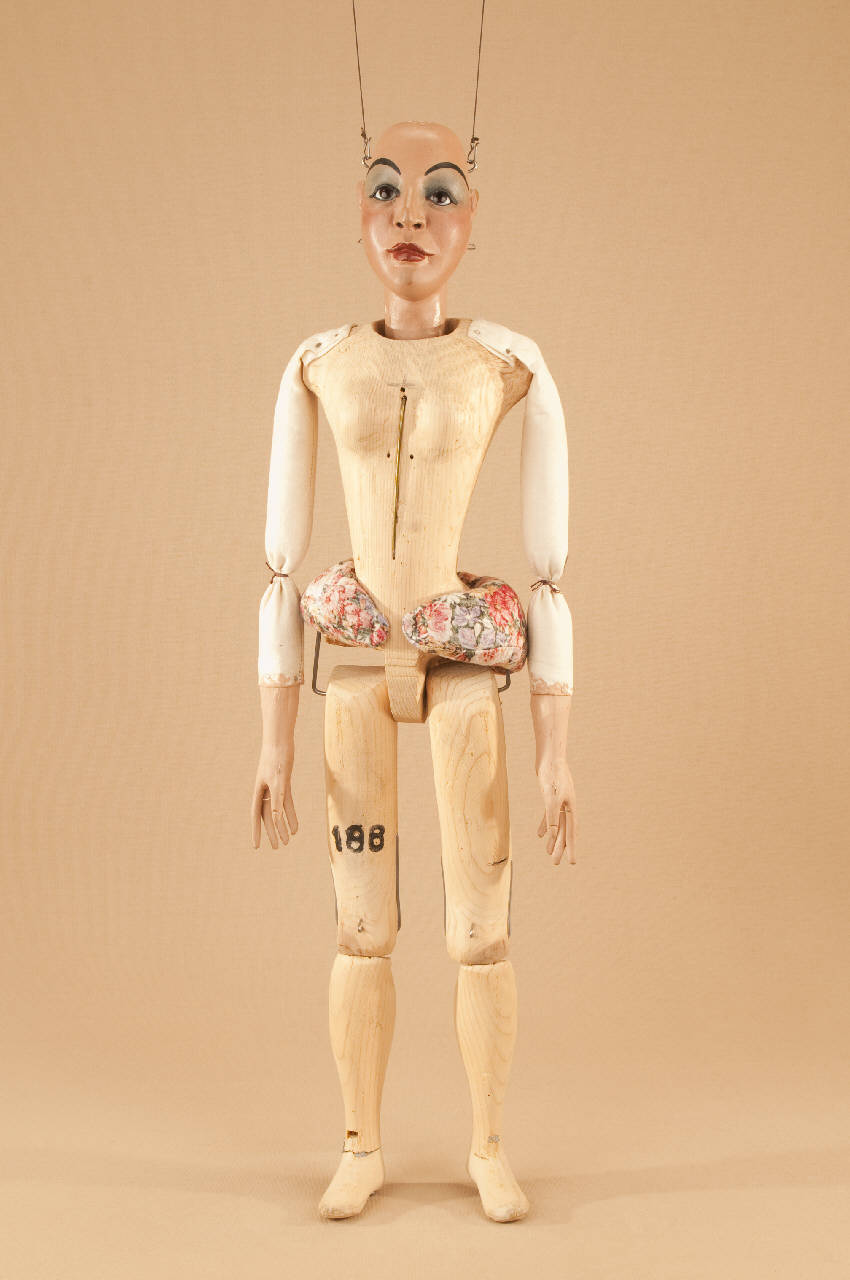 Testa di legno di tiglio fissata al corpo tramite ferro, occhi di vetro. Corpo normale in abete snodato in vita ad incastro. Gambe unite al bacino tramite bordione in ferro, ginocchia ad incastro mobile. Mani in tiglio con dita scolpite e separate. Bilancino a croce metodo Holden.
