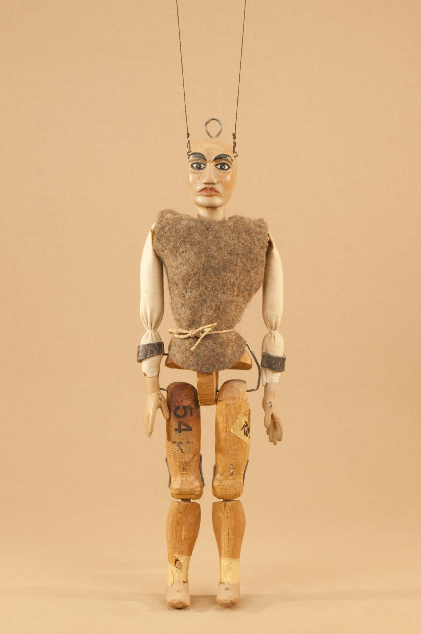 Testa di legno di tiglio fissata al corpo tramite ferro. Corpo piccolo in cirmolo tagliato in vita e raccordato con anelli e strisce in pelle . Gambe unite al bacino tramite bordione in ferro, ginocchia ad incastro mobile. Mani in pioppo con dita unite.