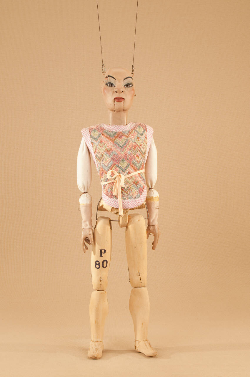 Testa di legno di tiglio fissata al corpo tramite ferro, occhi di vetro, bocca mobile. Corpo in abete. Gambe unite al bacino tramite bordione in ferro, ginocchia ad incastro mobile. Mani mobili in tiglio con dita scolpite e separate. Bilancino a croce metodo Holden.