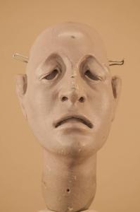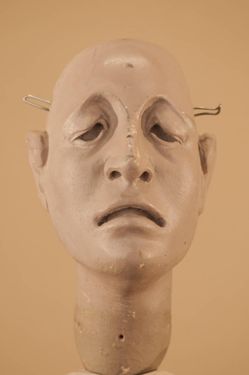Testa in legno di tiglio senza occhi di vetro e con forchinelle in acciaio alle tempie e alla base del collo.