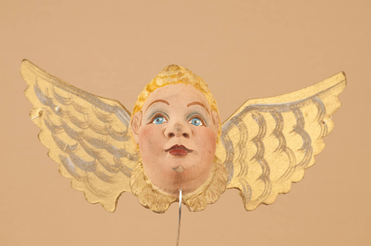 Testa in legno di tiglio. Ali in cartone unite con una molla piatta e inchiodate alla nuca.