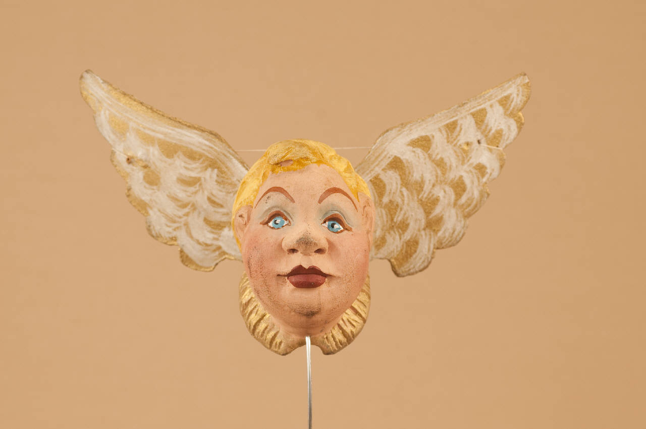 Testa in legno di tiglio. Ali in cartone unite con una molla piatta e inchiodate alla nuca.