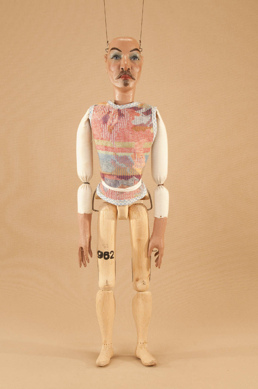 Testa di legno di tiglio fissata al corpo tramite ferro, occhi di vetro. Corpo normale in abete. Gambe unite al bacino tramite bordione in ferro, ginocchia ad incastro mobile. Mani in tiglio con dita scolpite e separate.