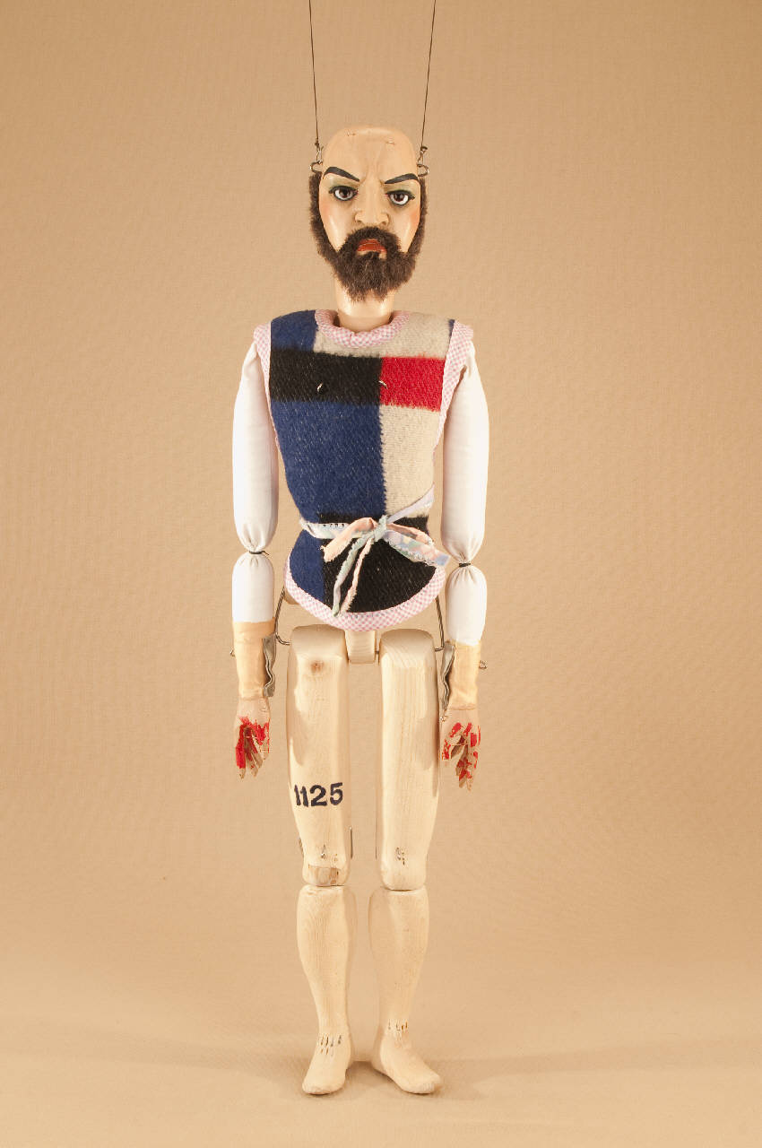 Testa di legno di tiglio fissata al corpo tramite ferro, occhi di vetro, bocca mobile. Corpo normale in abete snodato in vita ad incastro. Gambe unite al bacino tramite bordione in ferro, ginocchia ad incastro mobile. Mani mobili in tiglio con dita scolpite e separate. Bilancino a croce metodo Holden.