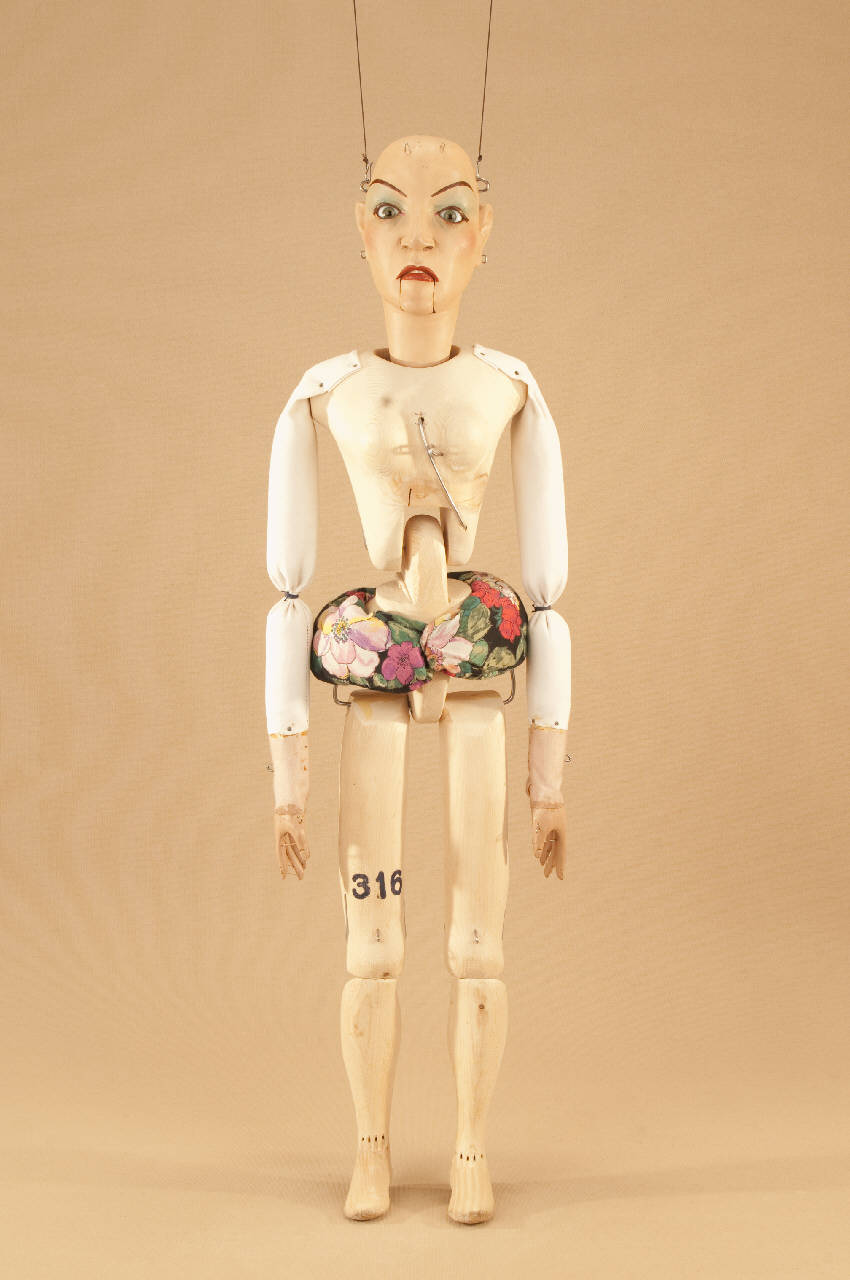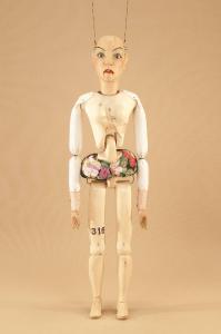 Testa di legno di tiglio fissata al corpo tramite ferro, occhi di vetro, bocca mobile. Corpo normale in abete snodato in vita ad incastro. Gambe unite al bacino tramite bordione in ferro, ginocchia ad incastro mobile. Mani mobili in tiglio con dita scolpite e separate. Bilancino a croce metodo Holden.