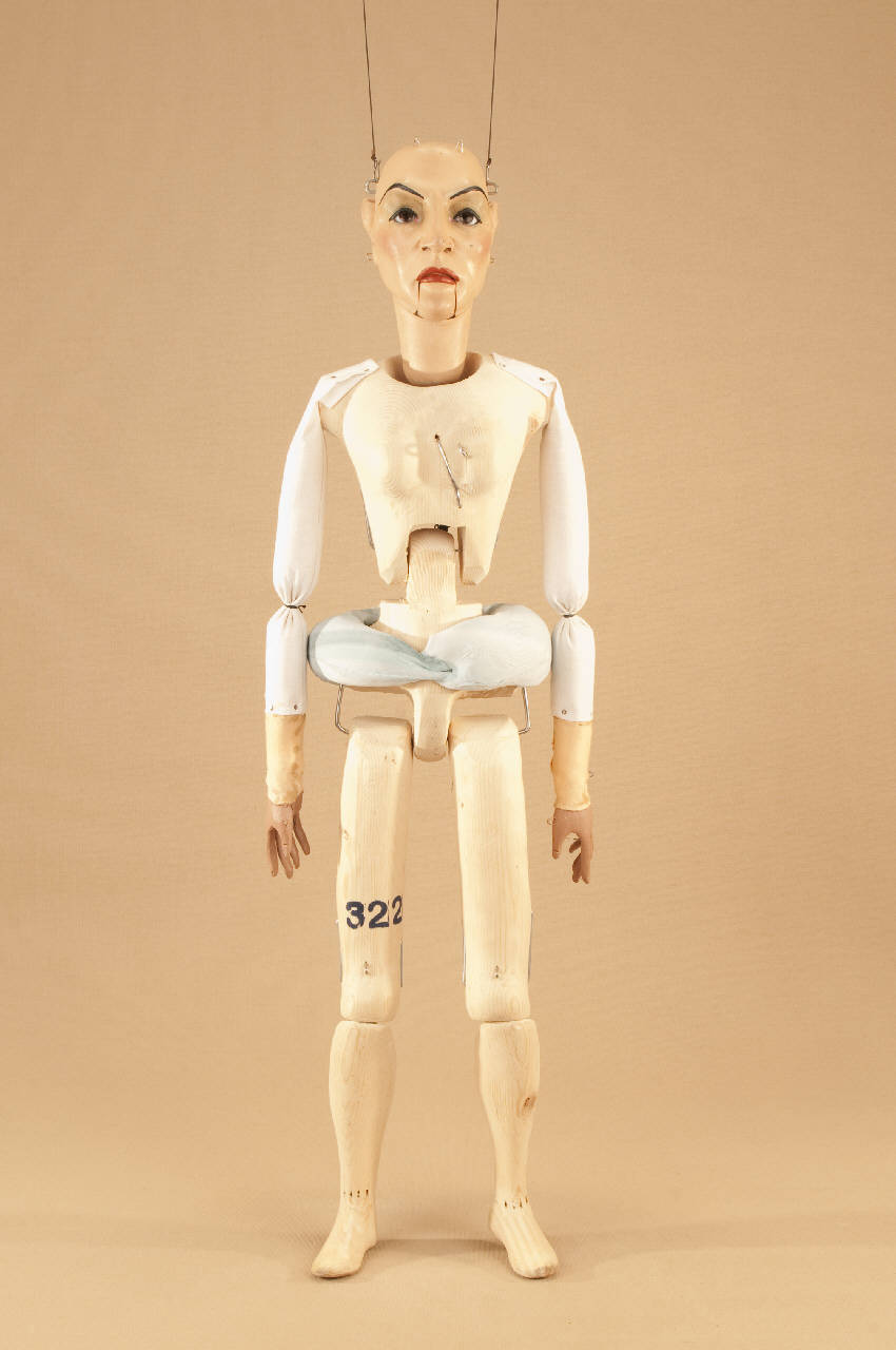 Testa di legno di tiglio fissata al corpo tramite ferro, occhi di vetro, bocca mobile. Corpo normale in abete snodato in vita ad incastro. Gambe unite al bacino tramite bordione in ferro, ginocchia ad incastro mobile. Mani mobili in tiglio con dita scolpite e separate. Bilancino a croce metodo Holden.