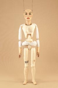 Testa di legno di tiglio fissata al corpo tramite ferro, occhi di vetro, bocca mobile. Corpo normale in abete snodato in vita ad incastro. Gambe unite al bacino tramite bordione in ferro, ginocchia ad incastro mobile. Mani mobili in tiglio con dita scolpite e separate. Bilancino a croce metodo Holden.