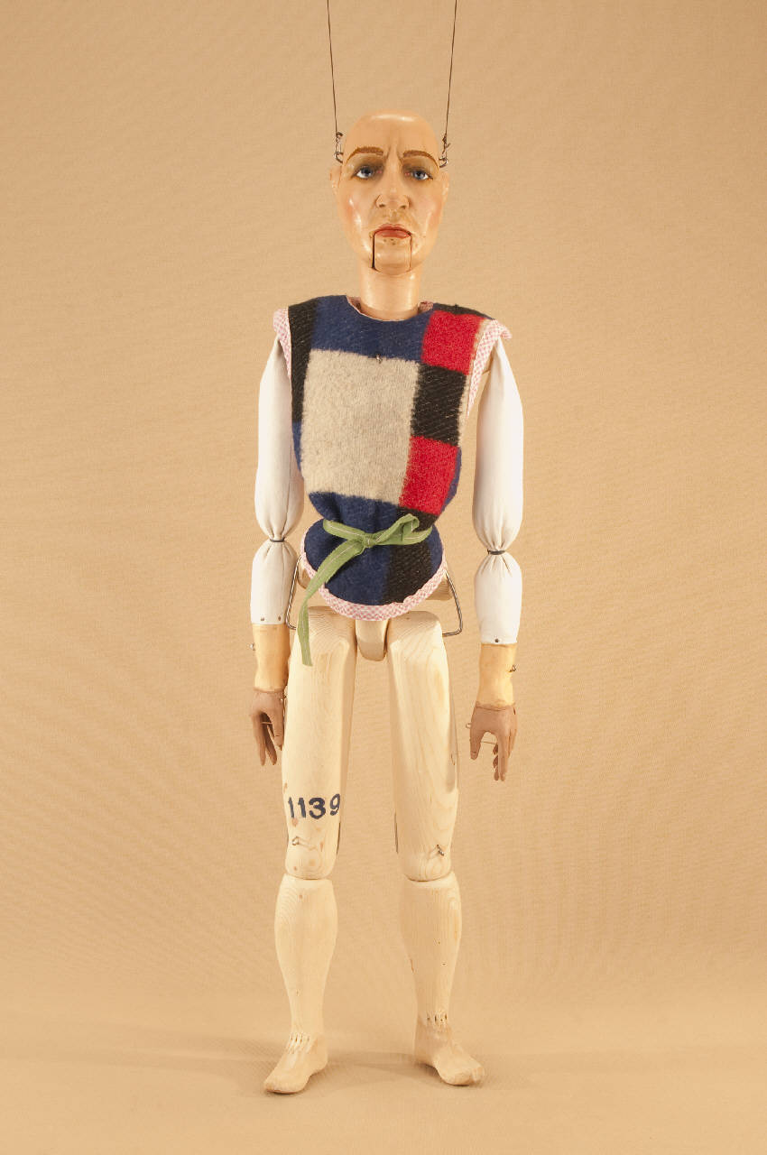 Testa in legno di tiglio fissata al corpo tramite ferro, occhi di vetro, bocca mobile. Corpo grande in abete snodato in vita ad incastro, gambe unite al bacino tramite bordione in ferro, ginocchia ad incastro, mani in tiglio mobili con dita scolpite e separate, piedi piombati, bilancino a croce metodo Holden.