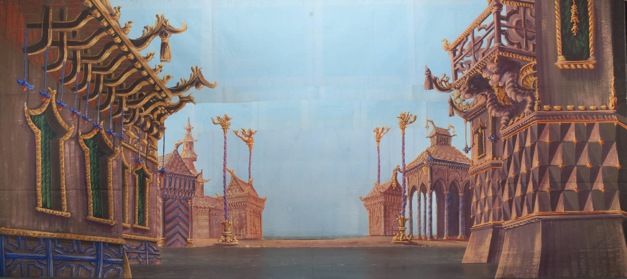 - NOTIZIE STORICO CRITICHE La scenografia è stata realizzata per la ripresa dello spettacolo "La Lampada di Aladino" che nasce come riduzione teatrale per marionette nel 1994. L¿argomento è tratto dalla fiaba "Aladino e la lampada meravigliosa", appendice della raccolta "Le Mille e Una Notte". Lo spettacolo di Eugenio Monti Colla, andato in scena in prima mondiale al Festival di Spoleto con musiche di Danilo Lorenzini, snoda il racconto in tredici quadri di ambientazione cinese come indicato nella fiaba d¿origine e narra l¿evoluzione del protagonista da giovinetto a uomo maturo attraverso vicende di carattere fantastico e simbolico. Il fondale in tulle viene utilizzato anche come completamento della scena "terrazza imperiale" (GOR10650) dello spettacolo La Lampada di Aladino.