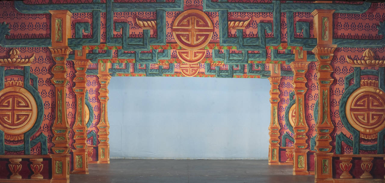 - NOTIZIE STORICO CRITICHE La scenografia è stata realizzata per la ripresa dello spettacolo "La Lampada di Aladino" che nasce come riduzione teatrale per marionette nel 1994. L¿argomento è tratto dalla fiaba "Aladino e la lampada meravigliosa", appendice della raccolta "Le Mille e Una Notte". Lo spettacolo di Eugenio Monti Colla, andato in scena in prima mondiale al Festival di Spoleto con musiche di Danilo Lorenzini, snoda il racconto in tredici quadri di ambientazione cinese come indicato nella fiaba d¿origine e narra l¿evoluzione del protagonista da giovinetto a uomo maturo attraverso vicende di carattere fantastico e simbolico. La scena GOR10650 viene completata utilizzando il fondale in tulle della scena "piazza" GOR06392 dello spettacolo La Lampada di Aladino.