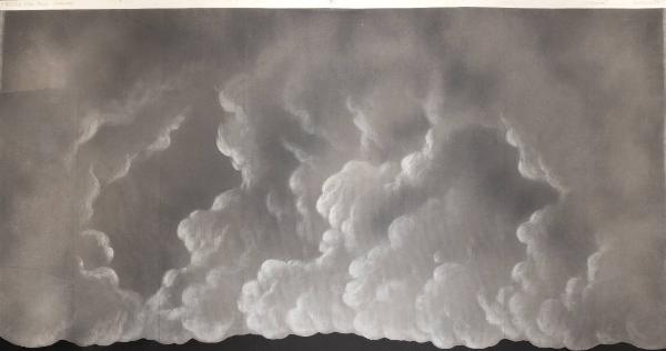 Velario in tulle dipinto a nubi e fortezzato ribattendo ed incollando i perimetri laterali e raddoppiando con una cinghia in cotone, il perimetro superiore del pezzo. Il lato inferiore è sagomato e non è fortezzato.