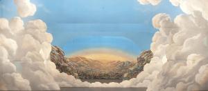 Scenografia composta da un fondale e tre principali. Supporto in carta siling avana extra da 80 g.mq dipinto con colori ad acqua uniti con leganti vinilici. Fortezzatura con strisce di tela in cotone di diversa grammatura incollate lungo i bordi perimetrali e lungo le linee di piegatura. diFili di cotone annodati ad asole di fettuccia, permettono di reggere le parti sagomate dei principali. Sul fondale è presente un'applicazione in tessuto leggiero per consentire una trasparenza.