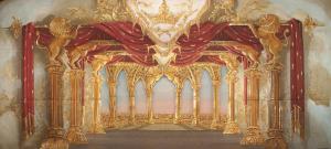 Scenografia composta da un fondale e quattro principali. Fondale in tulle opera dipinto con colori ad acqua e fortezzato lateralmente ribattendo lo stesso tulle cucito mentre nei perimetri orizzontali raddoppiando il bordo con una fascia in tela di cotone. Principali in carta siling avana extra da 80 g. al mq. dipinta con colori ad acqua uniti con leganti vinilici e fortezzati ai bordi perimetrali e lungo le piegature con strisce di cotone di varia grammatura. Applicazioni in carta dorata.
