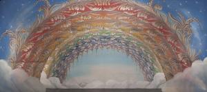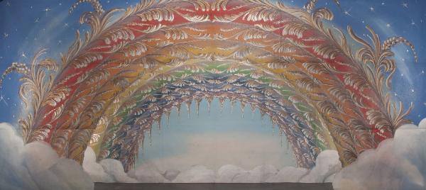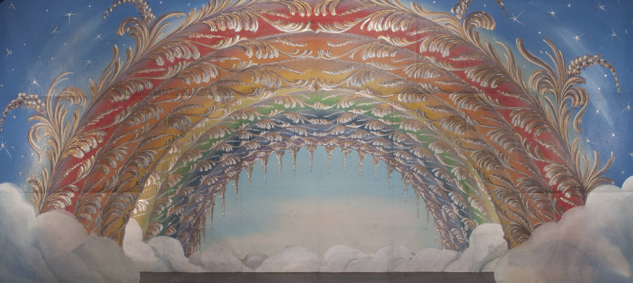 Scenografia composta da un fondale e un principale. Supporto in carta siling avana extra da 80 g. al mq. dipinta con colori ad acqua uniti con leganti vinilici e fortezzati ai bordi perimetrali e lungo le piegature con strisce di cotone di varia grammatura. Inserto in tela di cotone pelle ovo da 80 g. al mq. dipinta ad acqua. Applicazioni in carta argentata.