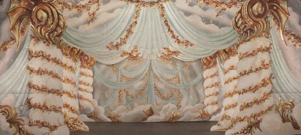 Scenografia composta da un fondalino e tre principali. Principali in carta siling avana extra da 80 g. al mq. dipinta con colori ad acqua uniti con leganti vinilici, fortezzati ai bordi perimetrali e lungo le linee di piegatura con strisce di cotone di varia grammatura. Applicazioni in carta dorata. Fondalino in tela di cotone da 200 g. al mq.