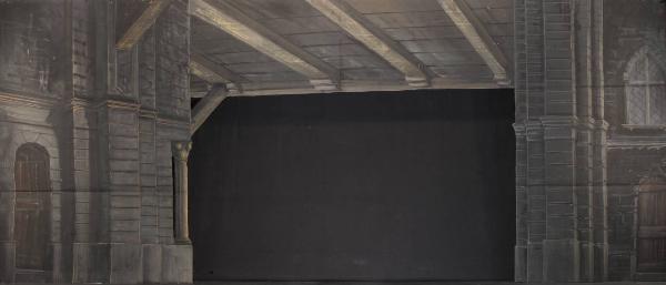 Elemento scenograico composto da un solo principale. Supporto in carta siling avana extra da 80 g. al mq. dipinta con colori ad acqua e fortezzata lungo i perimetri e le linee di piegatura con strisce in tela di cotone di diverse grammature.