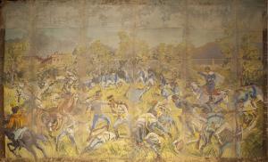 - NOTIZIE STORICO CRITICHE Il sipario veniva utilizzato come comodino. Fu realizzato per lo spettacolo dal titolo originale "L¿eroe dei due mondi, ovvero Garibaldi e i suoi tempi", epopea storico militare appartenente al repertorio storico della Compagnia Marionettistica Carlo Colla e Figli, fu rappresentato per la prima volta al Teatro Gerolamo di Milano nel 1932, in occasione del cinquantesimo anniversario della morte di Giuseppe Garibaldi.\nLa trama ripercorre le vicende della vita dell¿Eroe dei Due Mondi, da Nizza a Genova, dal Sudamerica a Roma e alla Sicilia, fino al ritiro a Caprera. Al di là del "medaglione" storico di carattere didascalico danno vita all¿azione drammaturgia i diversi personaggi nella loro funzione di commento corale. Ad essi si unisce il personaggio di Gerolamo, secondo la tradizione del teatro marionettistico che vuole la presenza del personaggio maschera a "commentare" le gesta dei grandi personaggi facendosi intermediario fra le azioni dell¿eroe indomito, la vita quotidiana del popolo e lo spettatore.\nL¿allestimento dello spettacolo in occasione delle celebrazioni di Garibaldi nel 2007 prevede l¿utilizzo di scenografie, marionette e costumi tratti dal repertorio storico e appartenenti all¿edizione del 1932, unitamente a materiali realizzati ad hoc per la nuova edizione a integrazione e/o sostituzione del materiale storico.\nLe musiche per lo spettacolo, scritte appositamente per questa nuova edizione sono del maestro Giuseppe Azzarelli.
