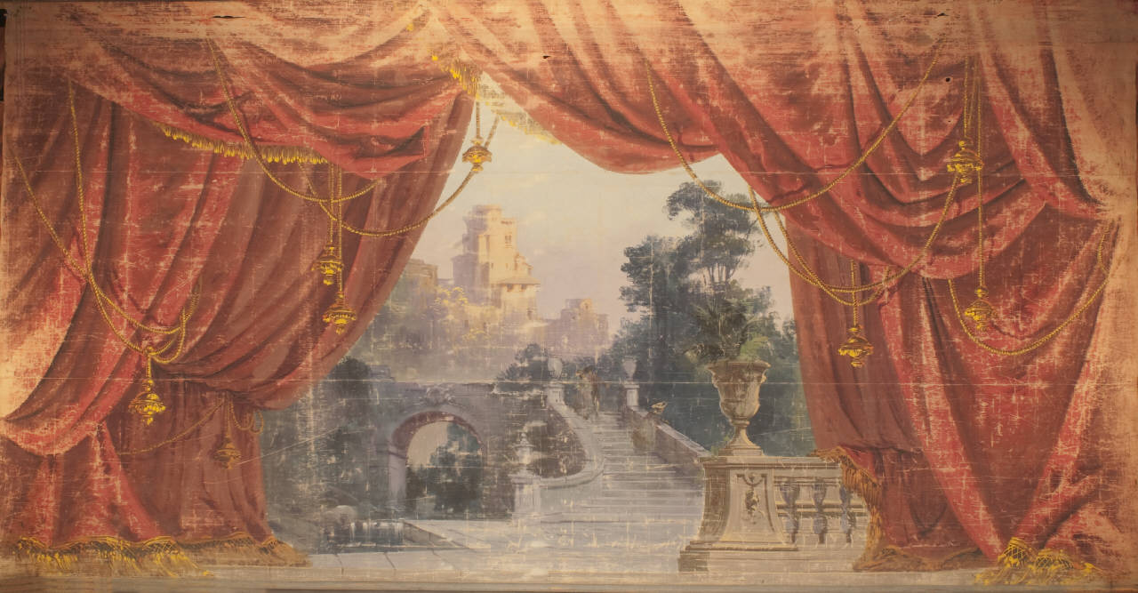 Sipario composto da un solo fondale. Supporto in tessuto di cotone da 180 g. al mq. dipinto con colori ad acqua e fortezzato lungo i perimetri.