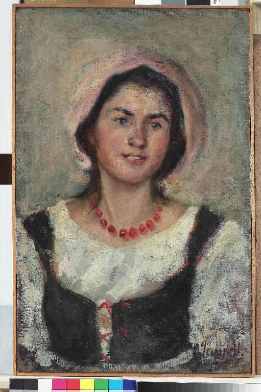 - NOTIZIE STORICO CRITICHE Lo sguardo dona alla giovane moglie dell'artista un aspetto luminoso; la spontaneità del momento e gli abiti rustici della donna aggiungono una ventata di freschezza al dipinto. Ci troviamo innanzi ad un ritratto, ma siamo lontano da quelli ufficiali commissionati dalla borghesia milanese. La libertà della dimensione domestica offre al pittore l'opportunità di schiarire la tavolozza e di abbandonare la formalità dei salotti ottocenteschi. Pasinetti incontra Teresina Marchetto nel 1896, ne scaturisce da subito un intenso legame. La ragazza ha solo sedici anni e i due si sposano nel 1901, due anni dopo la nascita del primogenito Lauro. I numerosi ritratti di Teresina sono dunque la testimonianza più viva di un amore, purtroppo tragicamente interrotto dalla prematura morte della giovane nel 1903 (Boifava, 2007, p. 28).