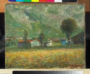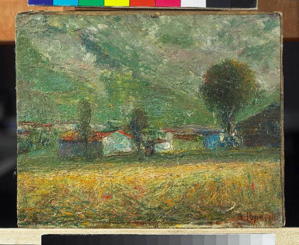 - NOTIZIE STORICO CRITICHE Antonio Pasinetti trascorre sovente periodi di vacanza a Bratto, una località della Presolana nelle valli bergamasche. La montagna costituisce per il pittore l'ambiente prediletto per dipingere impressioni dal vero. Si tratta di studi veloci realizzati su piccolo formato in cui l'artista cattura scorci di paesaggio elaborati nel taglio, nella luce e nel colore. Perno della composizione sono i casolari che rifulgono di rosso e di verde, preceduti da una radura che trabocca di vegetazione vibrante, resa attraverso guizzi di colore filamentosi e fitti che si incrociano in tutte le direzioni. Nel fondovalle sottili spatolate in molteplici varianti del verde creano consistenza e profondità (Boletti, 2007, p. 58).