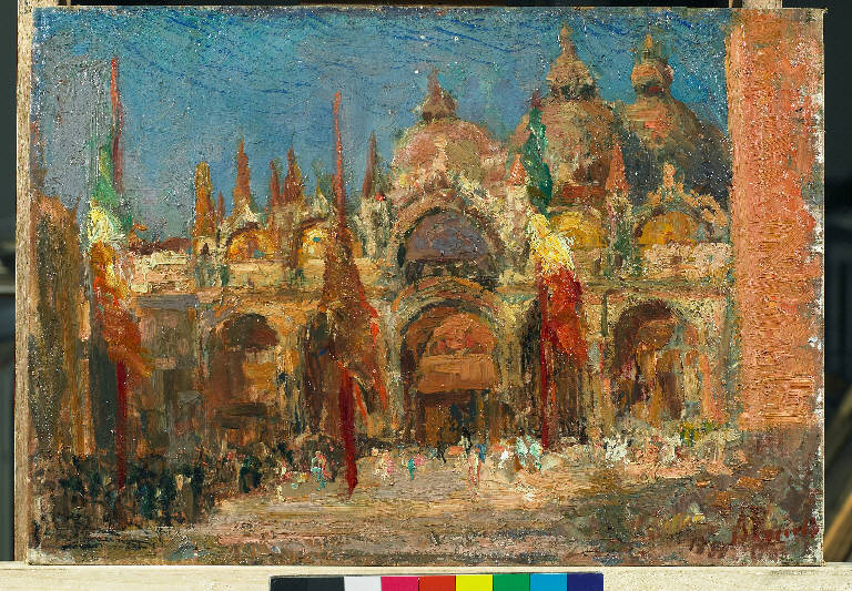 - NOTIZIE STORICO CRITICHE Il perno della composizione è il fornice centrale della basilica di San Marco, una quinta scenografica speciale che Antonio Pasinetti non manca di qualificare con effetti impressionisti. La grande chiesa si presenta come un tripudio di colori e di forme in cui pinnacoli e statue svettano nel cielo cobalto, così come la brillantezza oro dei mosaici riluce a distanza. La medesima felicità cromatica dilaga nello slargo urbano della piazza gremita di gente: una presenza minuta e rapida che rende al meglio il tumulto, la vivacità e la confusione di un giorno di festa (Boletti, 2007, p. 112).