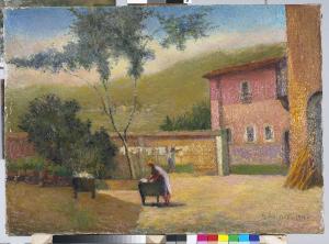 - NOTIZIE STORICO CRITICHE Il soggetto della cascina (Inv. PPMTA00054) è ripensato in studio, l'atmosfera calda si attenua attraverso trapassi chiaroscurali minuti che rendono il paesaggio rarefatto e quasi polverizzato. Il dinamismo e la forza del bozzetto lasciano spazio a una scena in cui le azioni dei personaggi si dilatano in una sensazione di sospensione temporale. La trattazione del medesimo soggetto in due codici così differenti è un chiaro segnale della consapevolezza del pittore dei suoi mezzi espressivi (Boletti, 2007, p. 119).