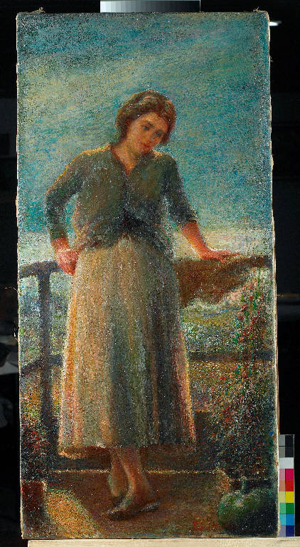 - NOTIZIE STORICO CRITICHE Con "Ritornerà?" databile 1900, ma opera di lunga e ripetuta pazienza: quasi sedici anni di ritorni di ispirazione e d'applicazione, abbiamo - è da supporre - il dipinto sul quale l'artista più s'indugiò anche affettivamente. Non essendo una pittura apertamente divisionistica, l'analisi estetica ne fa lo stesso una varizione e una elaborazione di temi noti tanto sentimentali che cromatici specialmente del divisionismo, pure, diremmo che la meccanicità del lavoro non ha distrutto, anche se triturandola, il complesso della poesia (Borgese, 1942, p. 62).\nCon un velato simbolismo, introdotto dal titolo dell'opera, Pasinetti evoca l'angoscia di un'attesa nella figura della moglie Teresina ritratta forse durante la gravidanza del secondo figlio Leone. La scelta figurativa ed il forte legame sentimentale che unì sempre il pittore di Montichiari a quest'opera trovano un curioso precedente in un noto dipinto di Angelo Morbelli, intitolato "La prima lettera" (1890), anch'esso gelosamente custodito dall'artista alessandrino poiché raffigurante la giovane moglie. Una vicinanza avvalorata dalla teccnica di Pasinetti, risolta come in Morbelli con la meticolosa stratificazione di colore trattato con un divisoinismo "polverizzato" e quasi impercettibile (Boifava, 2007, p. 39).