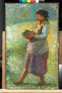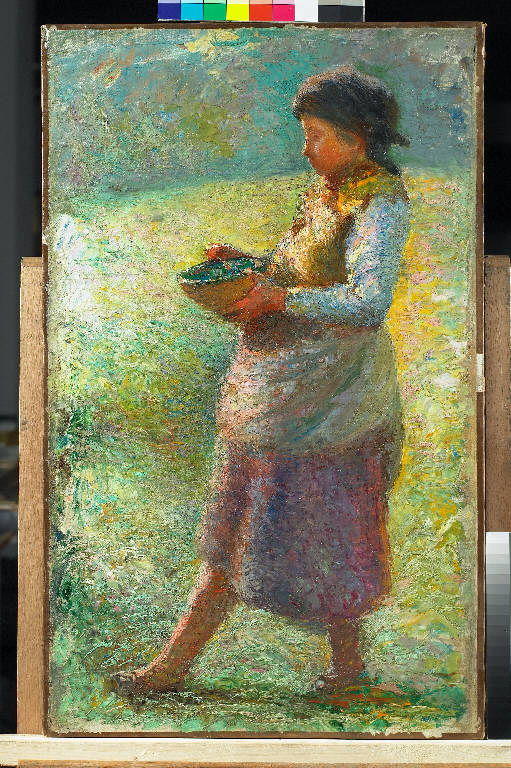 - NOTIZIE STORICO CRITICHE Con questo intimo capolavoro inedito Pasinetti si misura coerentemente e per la prima volta con la tecnica della divisione dei colori, adottata da alcuni pittori italiani nell'ultimo decennio dell'Ottocento sull'esempio del pointillisme francese. La giovane contadina, dall'aria timida e carezzevole, è osservata di profilo, in controluce, rivelando una gravidanza celata dall'ampio grembiule che ne impaccia i movimenti. Ma qualsiasi descrizione appare inutile quando pennello e spatola parlano da soli. La piccola sagoma della donna è infatti percorsa da un ventaglio cromatico, ostinatamente diviso in tocchi e filamenti di colori puri, solidi come smalto e talvolta mescolati direttamente sulla tela. Sicché la ricomposizione dell'insieme avviene a distanza, sulla retina dell'occhio, con esiti luminosi vibranti e di estrema suggestione in scoperto omaggio a Giovanni Segantini, il grande solitario divisionista, scomparso pochi anni prima nel 1899 (Boifava, 2007, p. 48).