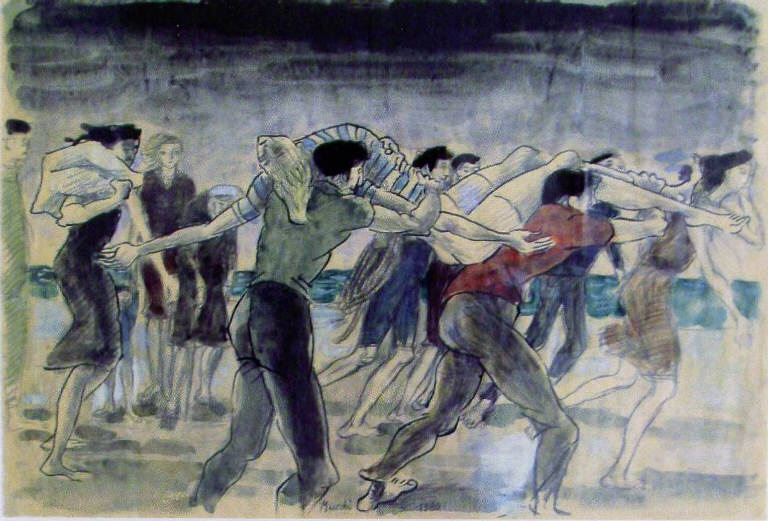 Sulla spiaggia, gruppo di persone. In primo piano due uomini trasportano sulle spalle il corpo dell'annegato.