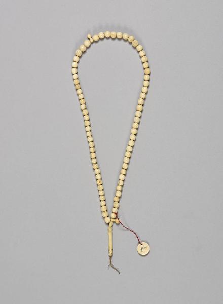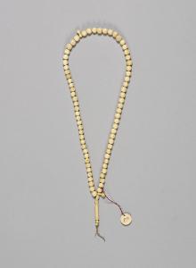 Collana (tasbih)usata dai fedeli musulmani per pregare, in osso composta da perline sferiche (diam. 0,7) con due elementi ovoidali allungati. La chiusura termina con un elemento cilindrico decorato.